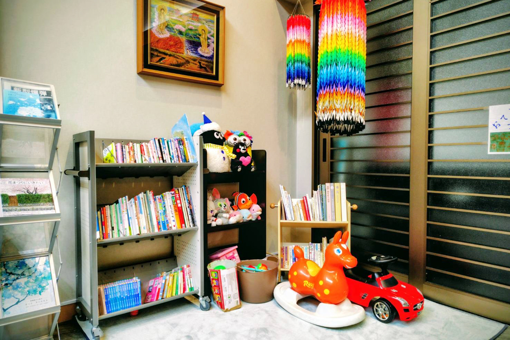 本堂内にキッズスペースがあります。絵本やぬいぐるみなどもございます。